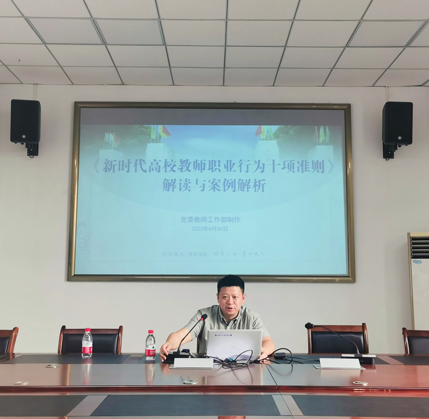 大会第三项内容全体教职工集中线上参加学校师德师风警示教育大会。学校会议开始之前,王熹书记带领全体教职工学习《新时代高校教师职业行为十项准则》,王熹书记通过案例分析,条分缕析地讲解了违反“十项准则”的具体表现形式,并告诫全体教职工要引以为戒,不折不扣做到“十项准则”,涵养高尚师德师风。