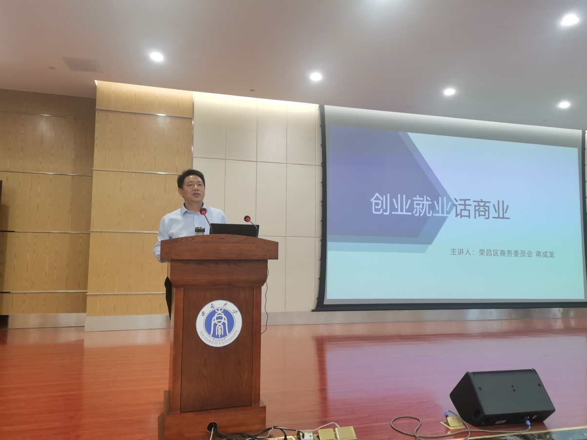 蒋成龙书记就荣昌区商业现状分析、荣昌区商业未来发展规划、大学生创业就业思路等内容展开,他指出,荣昌区当下按照“一区两圈、一圈多街、一圈一特色、一街一风格”工作思路,抢抓成渝地区双城经济圈建设重大战略机遇,有着前所未有的发展契机;并通过分享创业成功个人、先进企业等案例,鼓励当代大学生勇于创新、积极创业,希望best365英国体育在线学子以发展眼光看荣昌区商业机遇,并欢迎学子们扎根荣昌,创业发展;最后,他讲到“创业即就业”,就业创业更是探索人生价值的重要方式,地方政府与高校之间应加强合作,共促发展,探索有效的人才激励机制,实现人才就业创业的多元化、本土化。