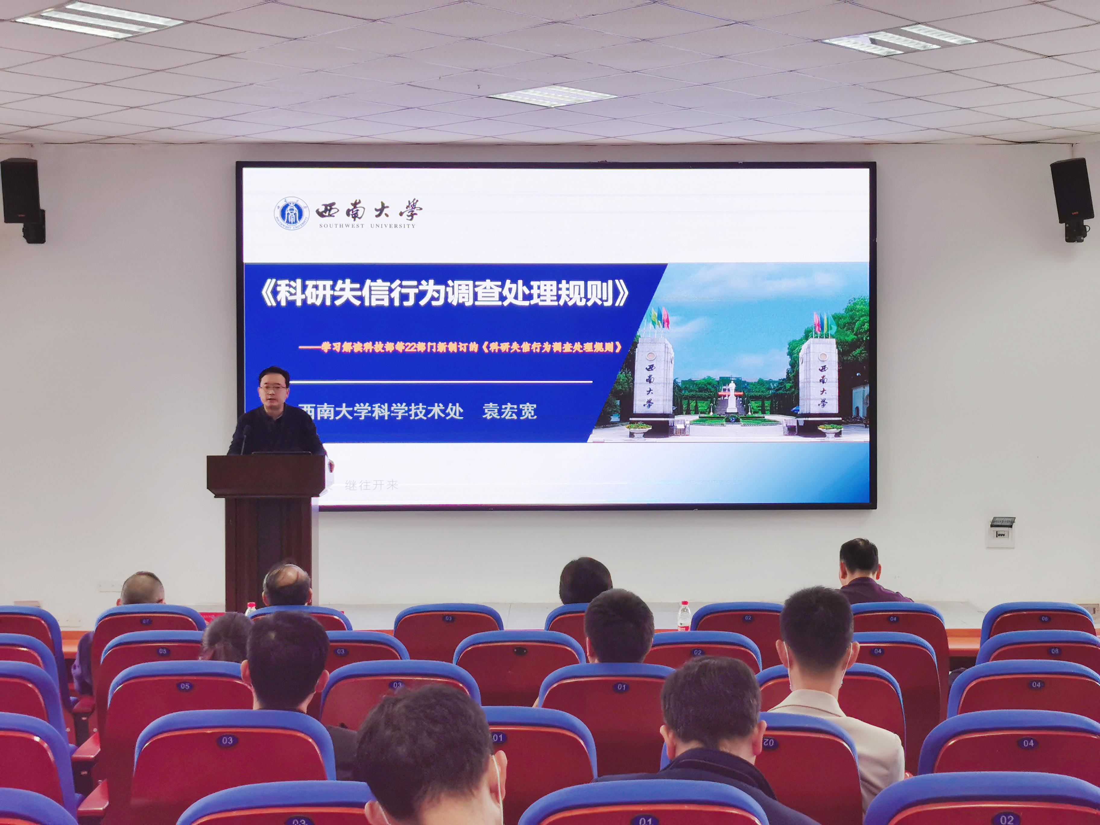 袁宏宽教授从科研失信现象出发,作了题为《学习解读科技部等22部门新制订的<科研失信行为调查处理规则>》的专题培训。他重点介绍了当前我国科研诚信法规政策,为师生们厘清了学术道德边界,同时阐述了各类科研失信行为的认定及处理。