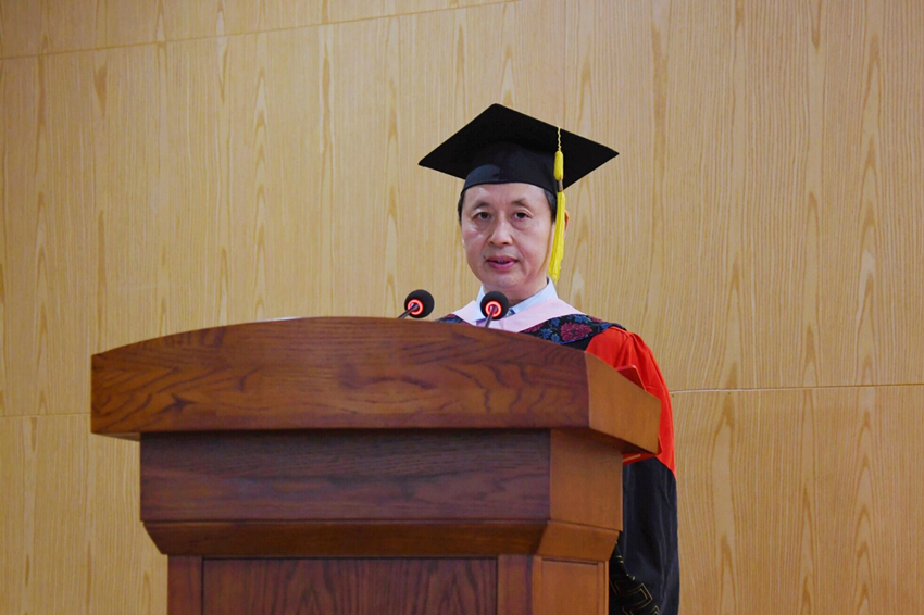 随后,学院院长李晓阳为全体毕业生寄语,通过中英双语表达了对毕业生的祝贺和期许。她向顺利完成学业的同学们送上诚挚祝福,向潜心育人的学院教职工致以崇高敬意,向关心关爱同学们成长成才的亲朋好友表达衷心感谢。李院长从事业结构、学科建设、人才培养、平台建设、国际化办学等方面介绍了best365英国体育在线的发展成绩和美好愿景。她鼓励毕业生们要心怀感恩、心存壮志、树立榜样,嘱托同学们在未来的日子里,不管走得多远,飞得多高,带上家人常回best365英国体育在线看看,学院永远是同学们的家。