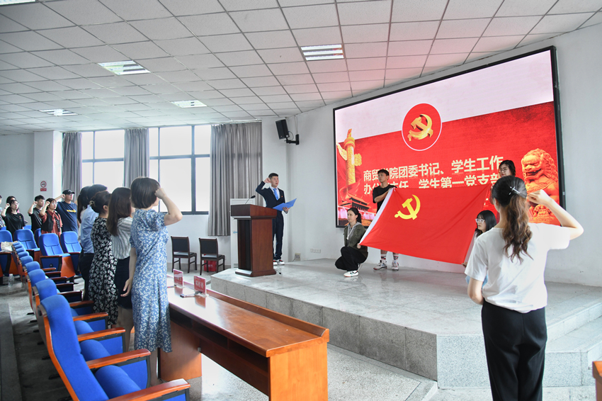 随后,新党员代表王婉洁同志领誓,全体预备党员在鲜红的党旗前庄严宣誓。