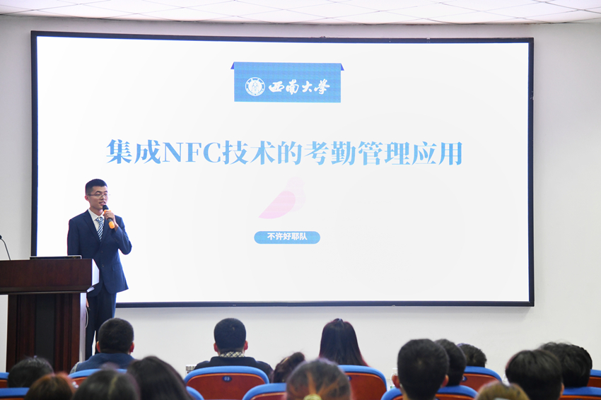 本次决赛,共有七支队伍参与角逐。“不许好耶队”将集成NFC技术运用到考勤管理应用之中,展示了软件的创新之处;“我们队”的签到软件基于安卓端与电脑端的结合,针对学生打卡进行软件设计;“软件设计扛把子队”的“今日打卡”App设计清新简约,围绕创新与自主进行设计;“进击的蛋蛋队”的“口袋考勤”App运用多种算法与程序,展示了软件的多功能用处;“The Debug”队通过分享他们的核心功能设计与收获感悟,展示了今日打卡App的形成与运用;“根正苗红队”别出心裁,通过现场演示客观地展示了“打了么”App;最后出场的“人生苦短,奈何不能remake队”详细介绍了软件的框架结构与功能,分享了“明日校园”App设计过程。