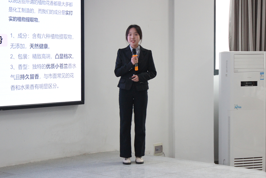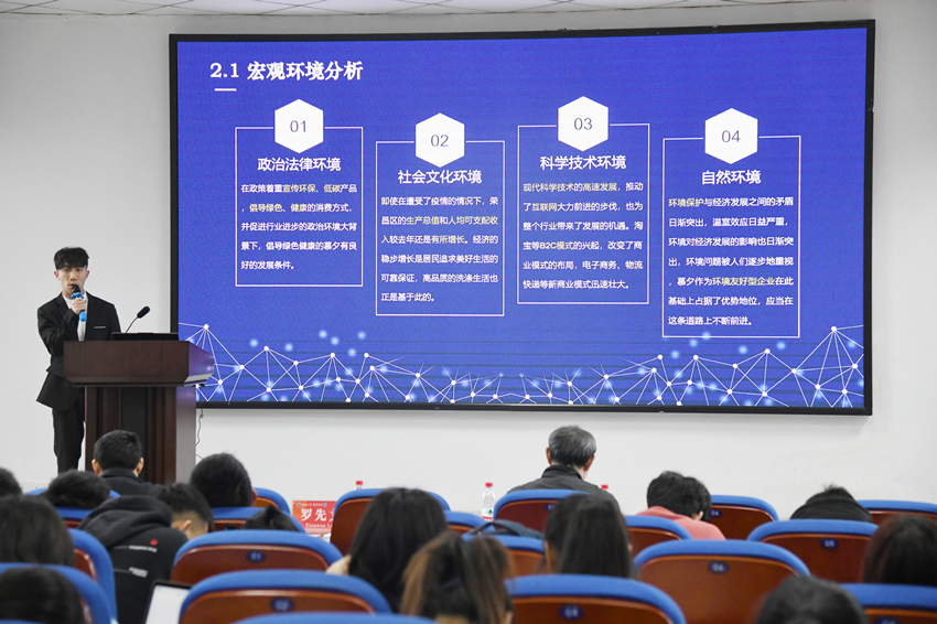 参赛队伍对商品及市场进行详细分析,提出综合线上线下共同营销的策划方案。其中抖音直播、微电影营销、制作宣传视频等新颖的营销方式受到现场好评。花木兰队采用SWOT分析方法对产品营销环境进行分析,并运用多种营销策略对产品营销进行规划。小猪佩奇队创新性地将产品营销与公益活动相结合,既响应了脱贫攻坚的号召,又体现了当代企业与大学生的社会责任感。