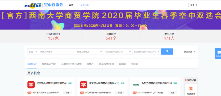 就业是最大的民生,为切实做好疫情形势下的就业工作,为毕业生提供更多更优质的就业资源,4月23日,学院举办2020届毕业生春季空中双选会,130余家用人单位参加双选,提供岗位超过500个。