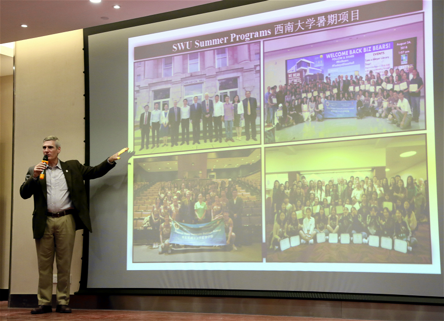 31日下午,布拉德副校长一行在学院举行了访学项目推介会,向与会学生介绍了访学项目的相关情况。他表示,西南大学学生求知好学,创新能力强,实践能力突出,希望两校能不断探讨新的合作项目和机制,欢迎更多同学到密苏里州立大学学习。