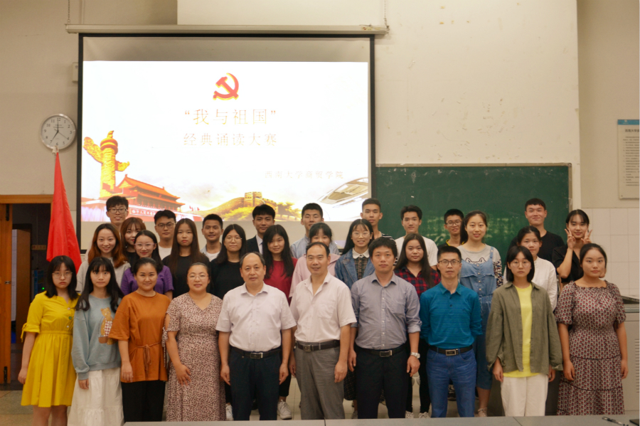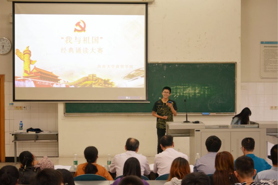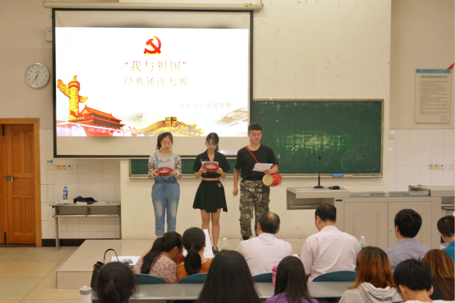 为深入学习贯彻习近平新时代中国特色社会主义思想,扎实深入开展“不忘初心、牢记使命”主题教育,隆重庆祝建国七十周年,传承中华优秀传统文化,大力推广和规范使用国家通用语言文字,9月20日晚,学院隆重举办了“我与祖国”经典诵读大赛。学院党委书记周国安同志、主管教学副院长胡继宽同志、办公室主任黄维兵同志、团委书记廖鹏同志、组织员刘光英同志,党务秘书刘莉莉同志出席了本次大赛并担任评委。