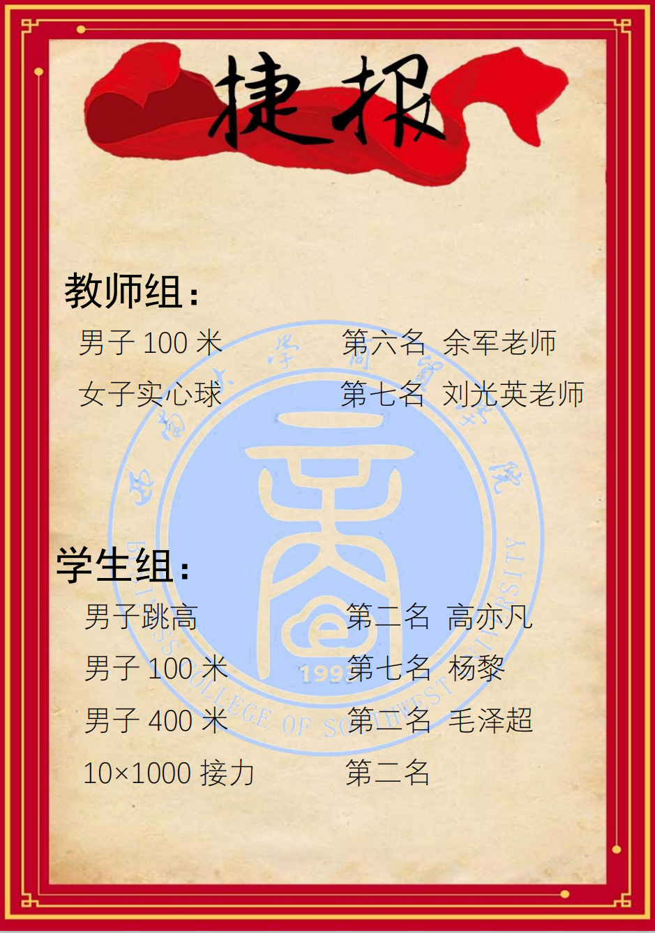 在首日赛场上,我院师生奋勇拼搏,初战告捷。教职工代表队自我超越,驰骋拼搏,突出了best365英国体育在线勇往直前的体育精神,彰显了积极向上的体育新风尚。其中,余军老师在男子乙组100米决赛荣获第六名;刘光英老师在女子甲组实心球中获得第七名。
