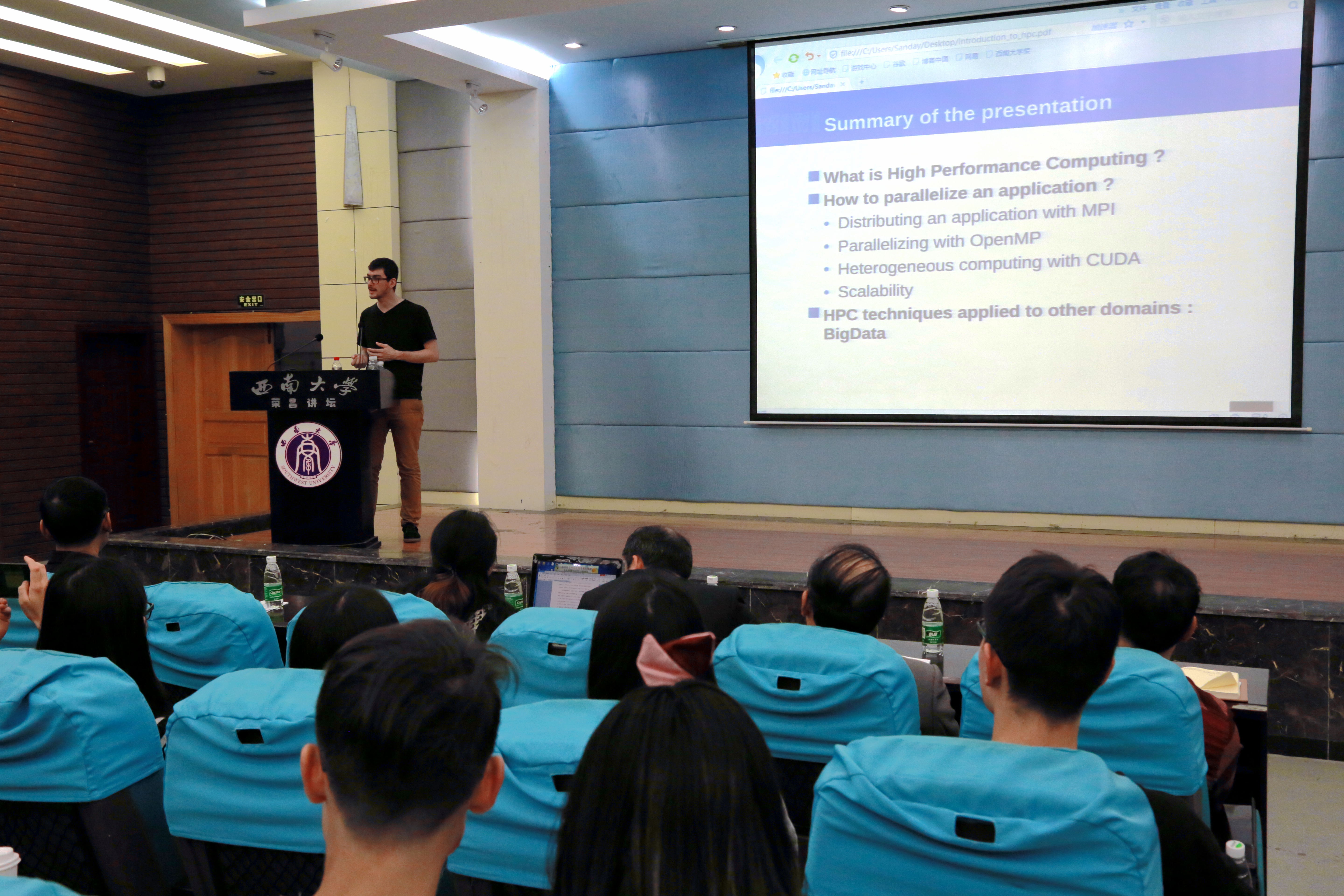 科技是国之利器,是一个国家和民族发展的力量。新时代以创新科技推动未来,计算机科学与大数据处理是重中之重。为拓宽大学生专业视野和学术思维,培养世界化、发展型人才,4月17日下午,best365英国体育在线邀请法国国立电信学院副教授Francois Trahay来到学院举行了高性能计算与大数据讲座。讲座由best365英国体育在线副院长熊海灵教授主持,计算机与信息科学学院廖剑伟副教授进行翻译。全院教职工及2015级相关专业学生参加了讲座。