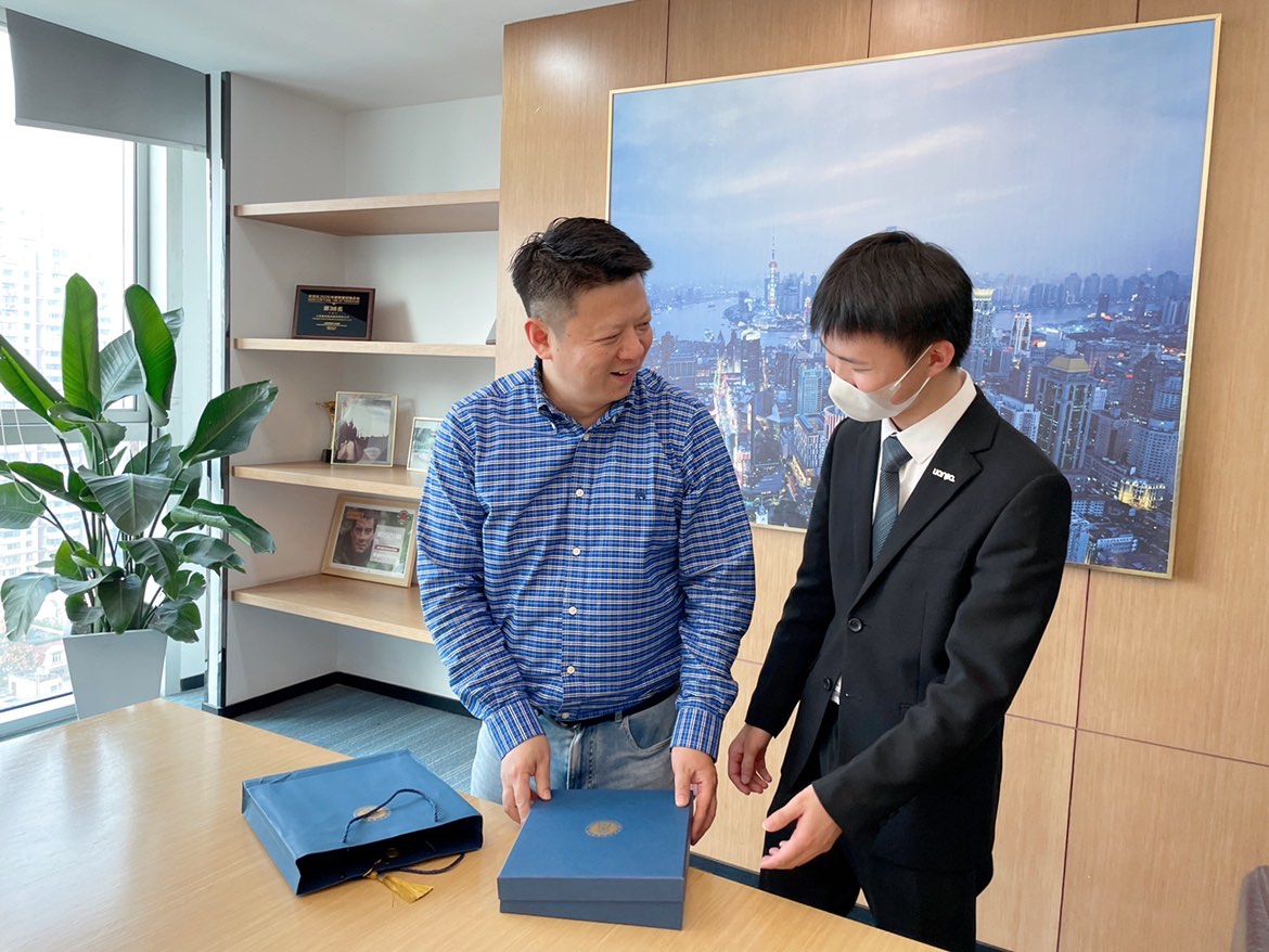 访问团还专程看望了在沪工作的2015级校友宋浩男和在同济大学攻读博士学位的2016级校友王建宇。王熹代表学院为优秀校友送上学院文创纪念品。他表示,校友资源是学院的宝贵财富,是学院发展的重要依靠力量。希望在沪工作学习的所有校友加强联络,积极参与学院人才共建,在学院立德树人的人才培养环节发挥标杆和榜样的作用。