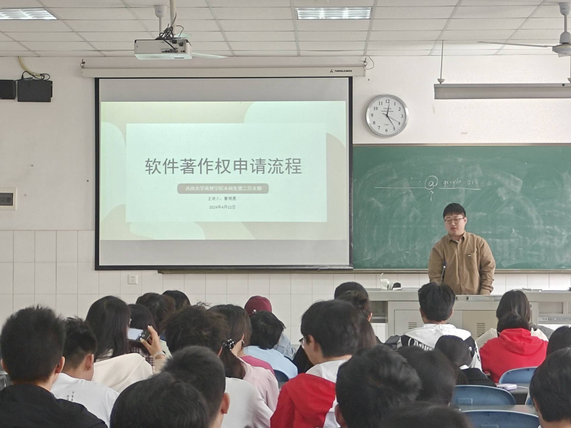 青年先锋,优秀党员树榜样 “让青年人讲给青年人听”,本科生第二党支部党员曹明晟同志,为团员青年做《软著申请》的讲座。曹明晟同志以自身经验为基础,将软著申请相关流程和经验传授给学弟学妹们,同时分享了自己在学习、工作方面的经验,鼓励同学们积极创新、勇于尝试,掌握知识本领,为党和国家建设贡献更多青春力量。