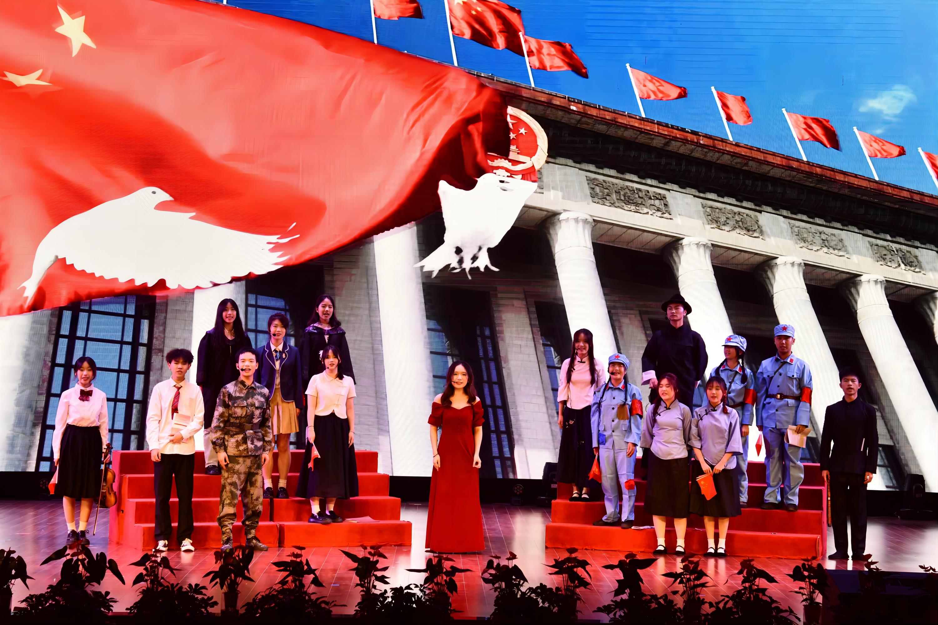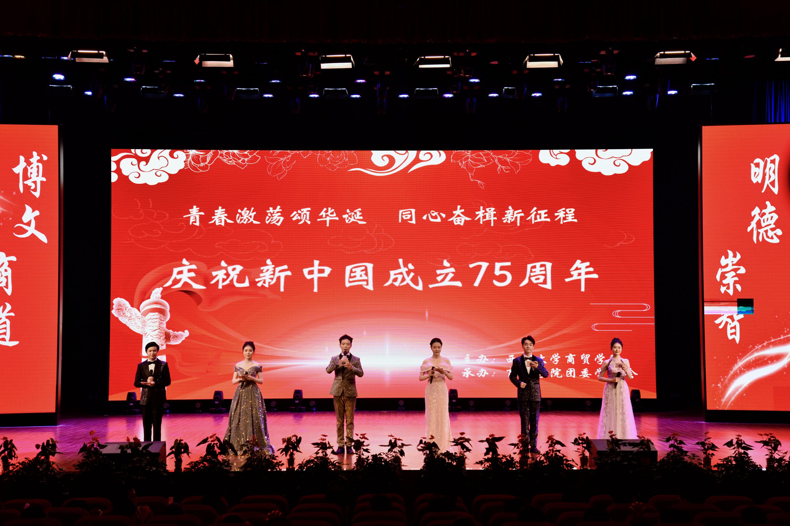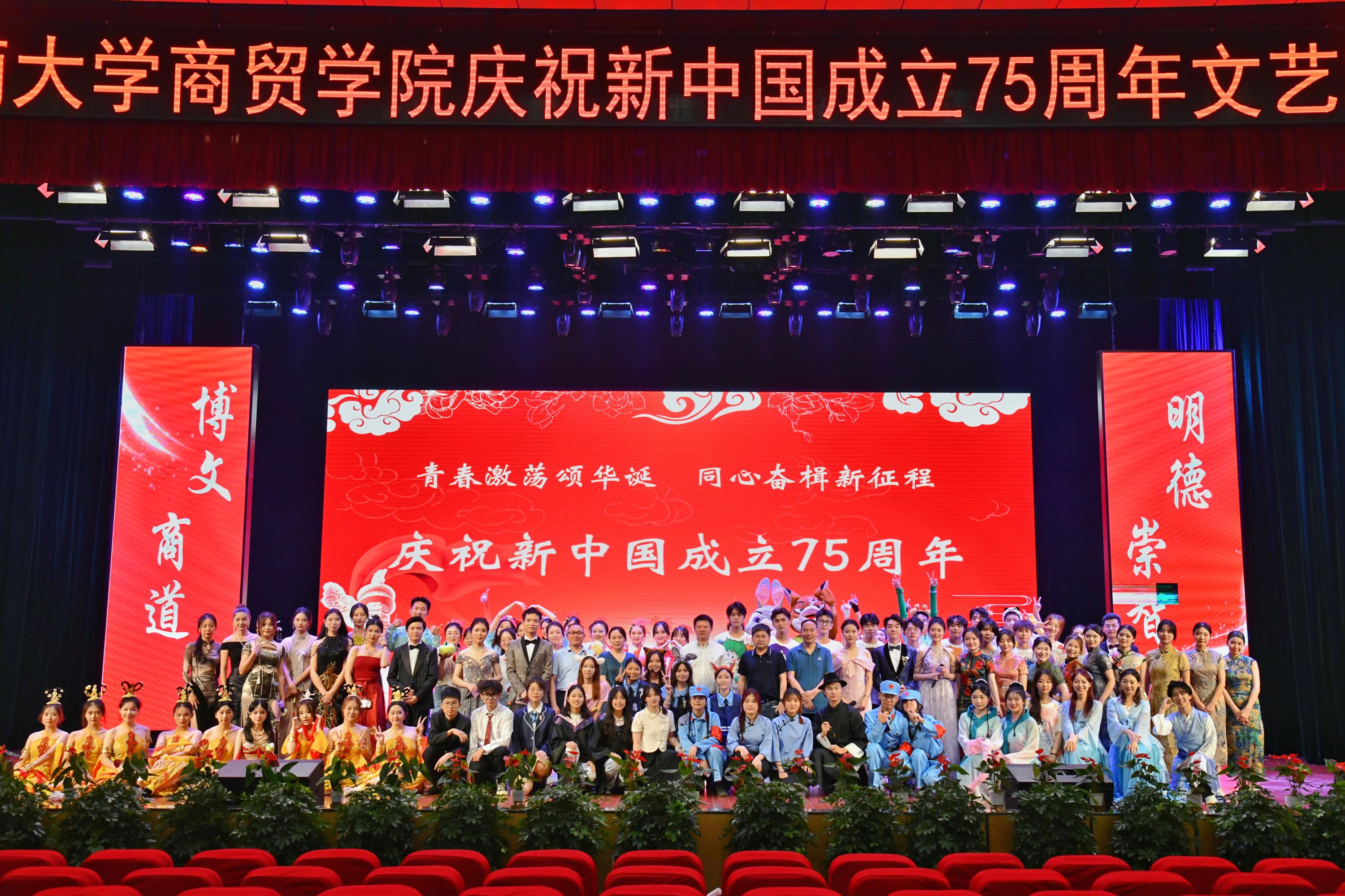 这一场视听盛宴让大家喝彩于国家的繁荣昌盛、民族的团结和谐、人民的安康幸福,更赞叹于历史的源远流长、文化的博大精深。每一个跃动的音符、每一幅动人的画面,都是为这片热土而自豪、为美好的明天而期待的生动说明。希望商贸学子把握历史机遇、担负时代使命,志存高远,脚踏实地,挺膺担当,怀抱“丹心报国”的凌云壮志,以青年之力,逐中华之愿!让我们接续奋斗,共迎新中国75华诞!