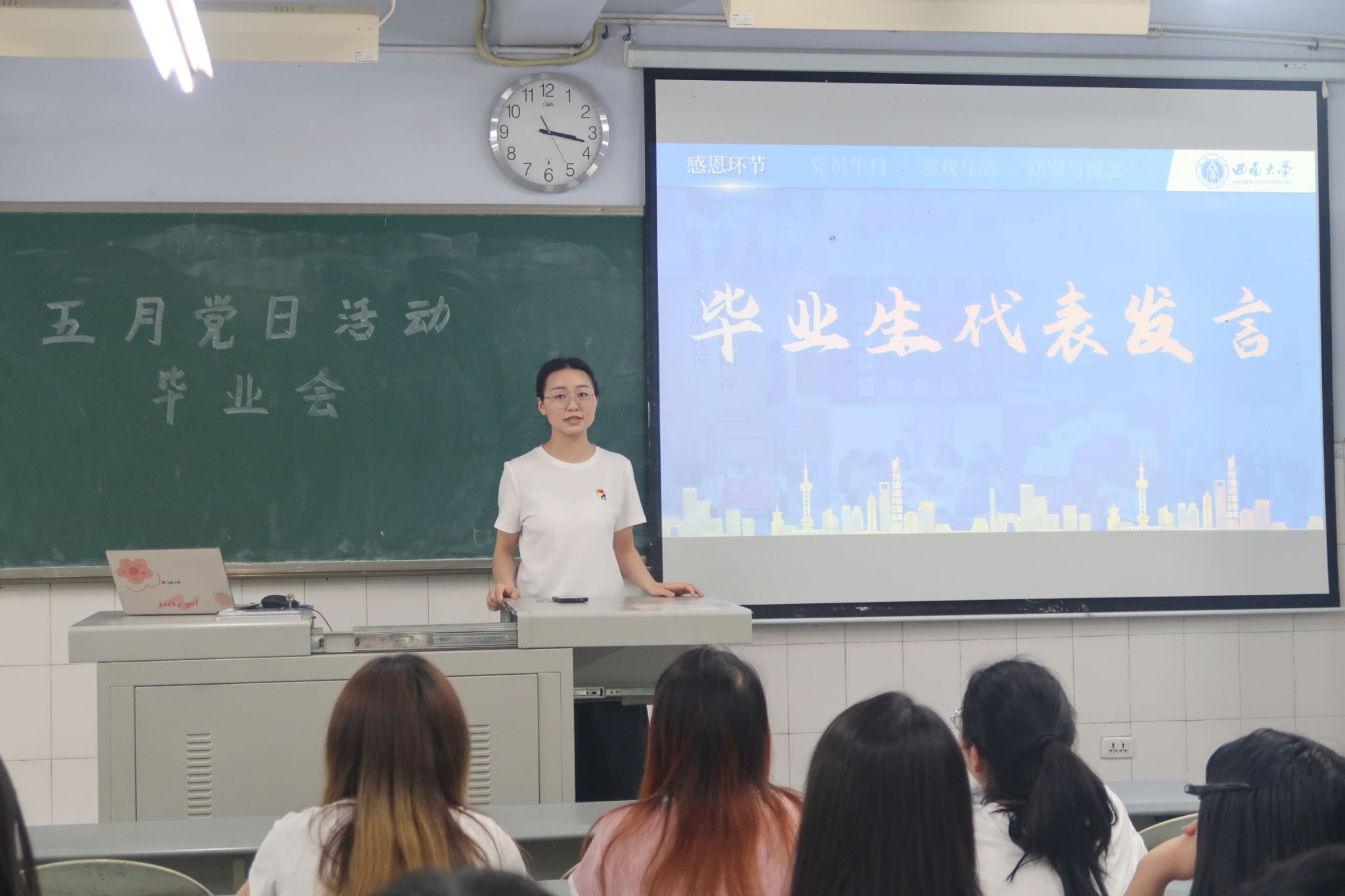 看完党支部短片后,三位毕业生党员代表说出自己的心里话。党支部组织委员杨玉连同志表示,支部党建工作任务重,加班加点是常态,但感恩党支部和学院搭建的成长平台,感恩党支部党员同志的大力支持,让自己能够逐渐成为独当一面、有一定韧性的“大人”。吕媛媛同志和张洋闻同志对比了入党前后的变化,对比了进校之初和临别之际的差异,可用一句话概括,“坚定自己的信念与追求,并且不断努力,自己想做的事终究会实现。”