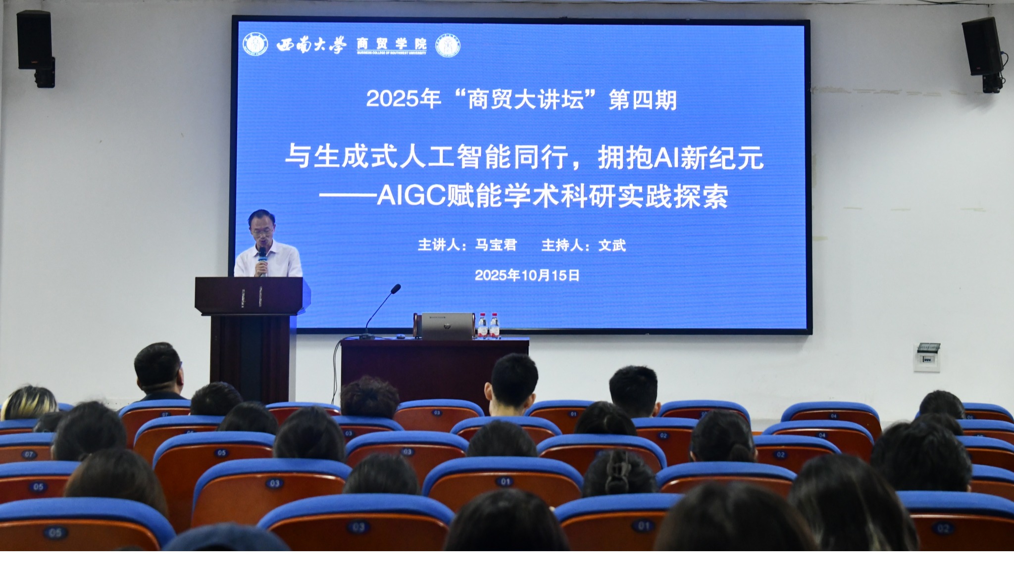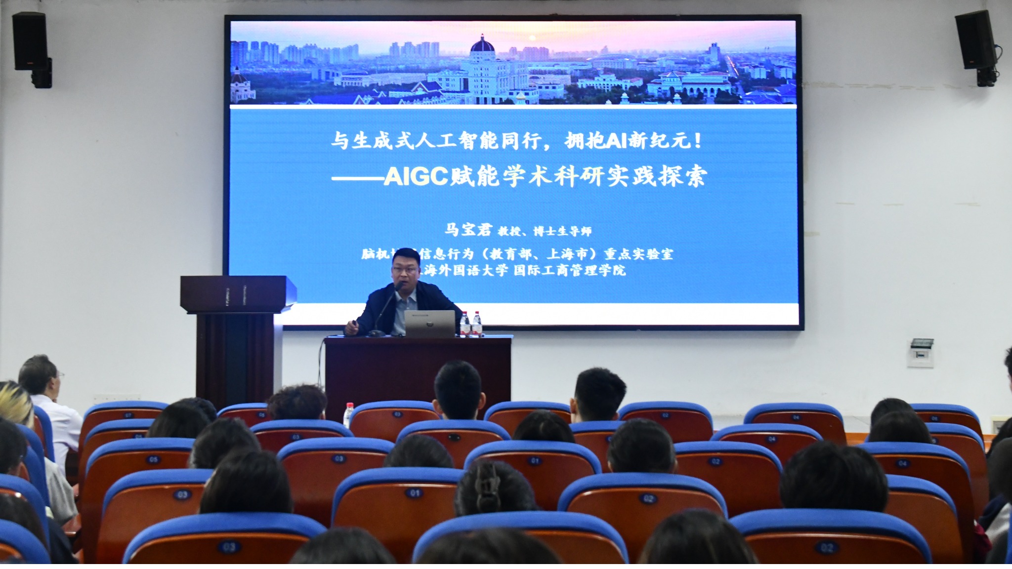 10月15日,best365英国体育在线在9601报告厅顺利举办第四期“商贸大讲坛”——“与生成式人工智能同行,拥抱AI新纪元--AIGC赋能学术科研实践探索”专题讲座。本次讲座特邀上海外国语大学马宝君教授担任主讲,学院党委副书记文武主持,吸引了众多师生积极参与。