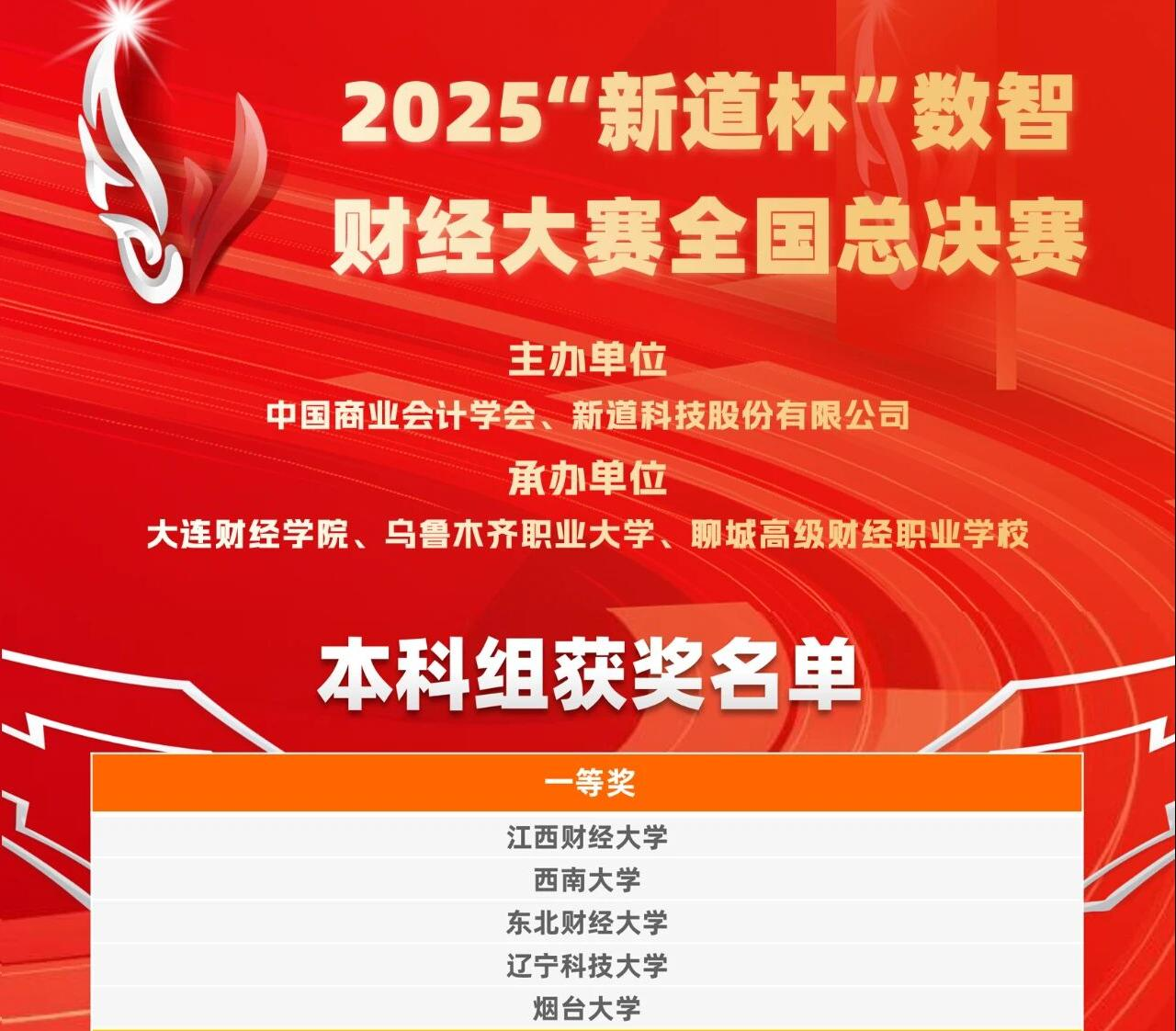 近日,2025“新道杯”数智财经大赛全国总决赛圆满落幕。学院2024级市营5班王韩政、国贸1班孙雨杰、管科2班骆晨、管科4班魏士杰在教师沈忠明的精心指导下,凭借扎实的专业功底、出色的数智工具应用能力以及高效的团队协作,从全国48支本科院校代表队中脱颖而出,荣获本科组全国总决赛一等奖。