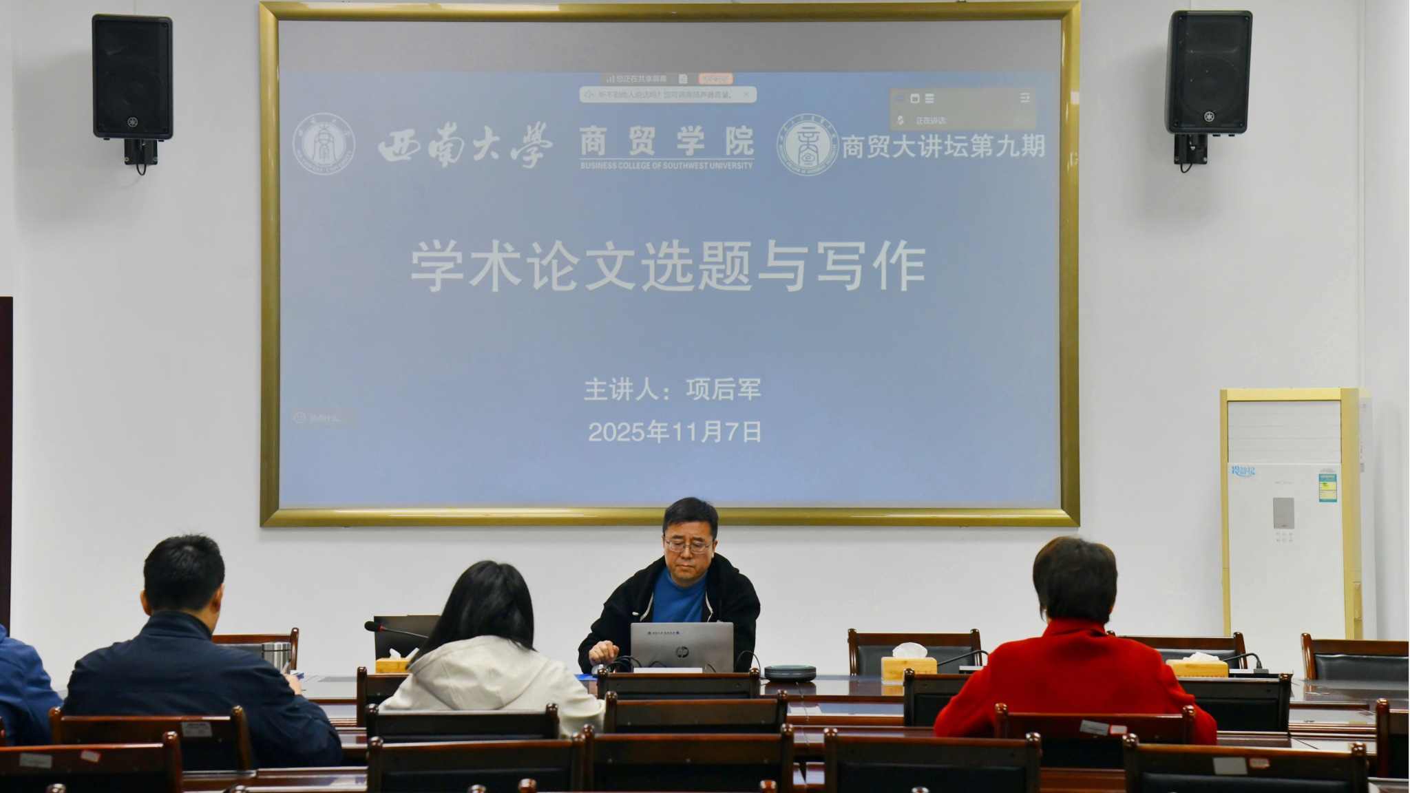 11月7日下午,best365英国体育在线在荣昌校区8401报告厅顺利举办第九期“商贸大讲坛”——“学术论文选题与写作”专题讲座。本次讲座特邀南开大学经济学博士、广东金融学院金融与投资学院院长项后军教授线上主讲,活动现场由学院副院长高远东教授主持,学院师生共约60人参加。