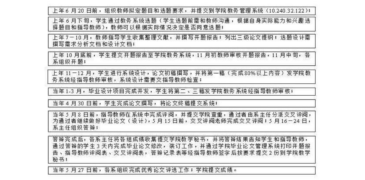 学院的本科生毕业论文(设计)分选题、开题报告、设计和撰写、答辩和总结五个阶段,实行二级管理体制,即以分管副院长领导,各系具体实施。学院各有关部门应积极支持、主动配合,共同把毕业论文(设计)工作做好。