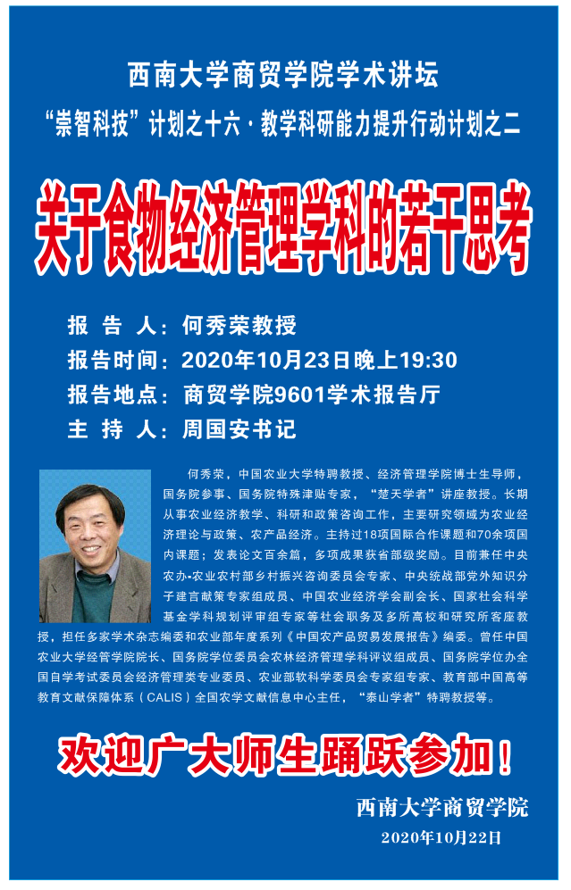 讲座:教学科研能力提升行动计划之二:关于食物经济管理学科的若干思考