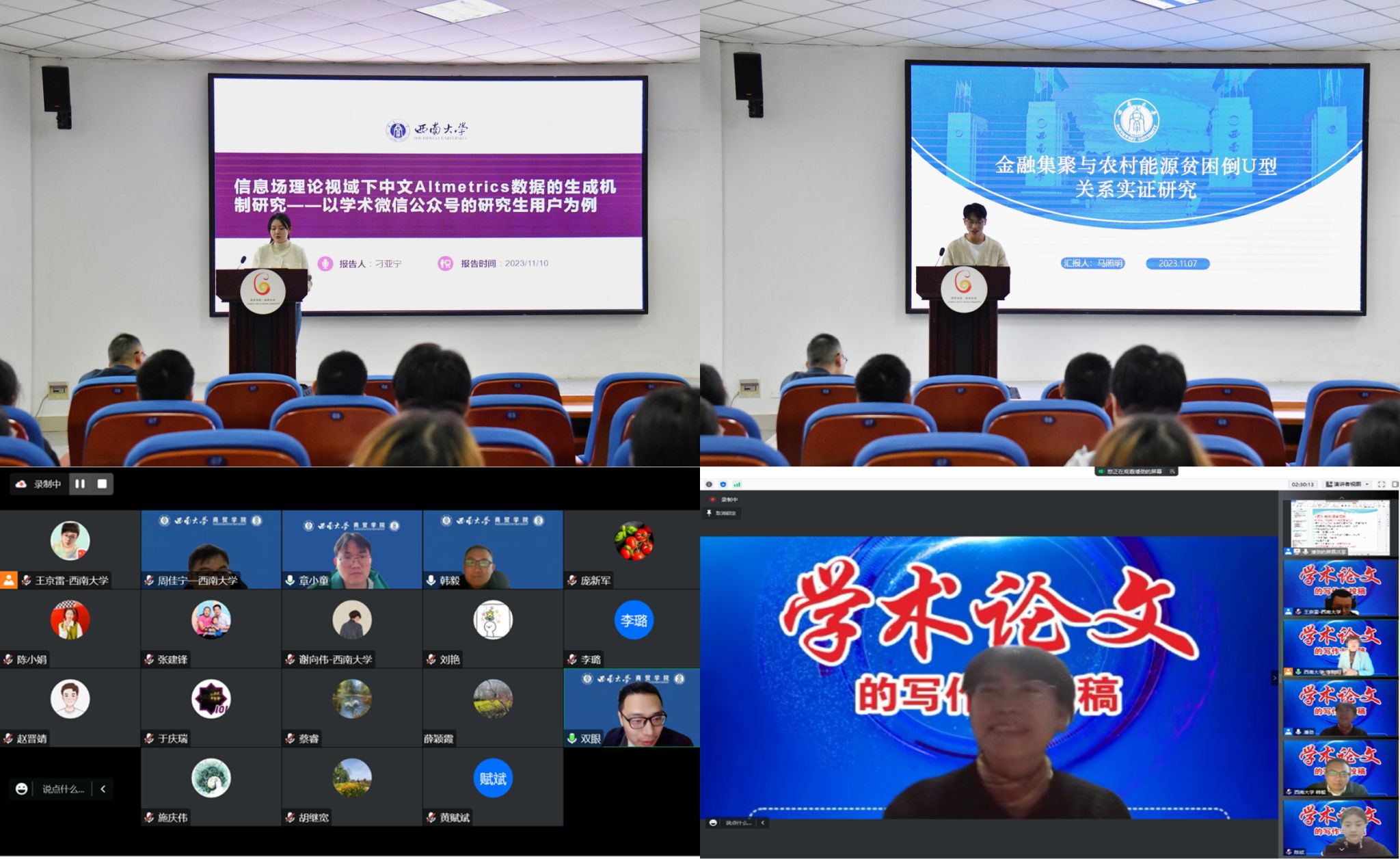 聚焦平台建设,激发科研创新热情,营造有组织科研氛围。为营造深厚的科研氛围,学院出台了《西南大学best365英国体育在线学术沙龙方案(试行)》《西南大学best365英国体育在线本科学生学术研究资助实施办法(试行)》等“一揽子”办法和措施,在各个层面举办学术研讨及学术沙龙活动,搭建师生学术交流平台。2023年,学院共组织学术交流活动20余场,培育了学院的学术交流氛围,尤其是将学生的自发科研转变为有组织、有步骤、有目标的科研过程,实现了教师与学生科研的协同发展。