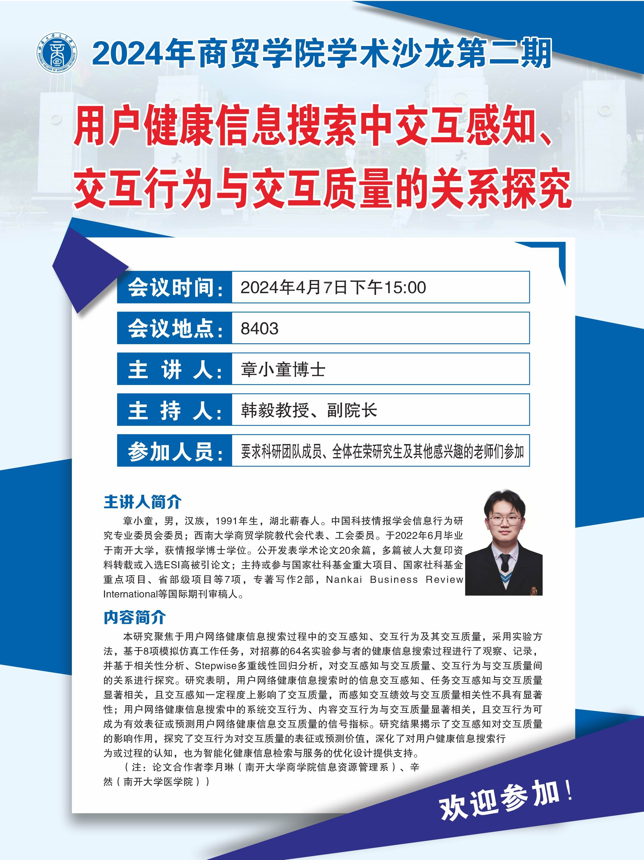 best365英国体育在线2024年学术沙龙(第二期:用户健康信息搜索中交互感知、交互行为与交互质量的关系探究)通知